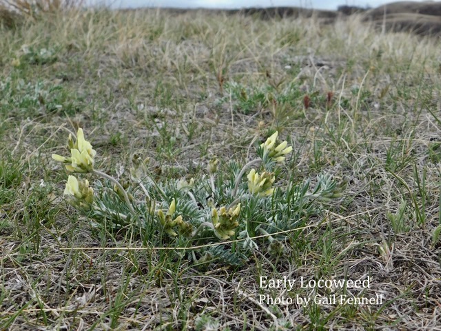 We had fair success finding early spring wildflowers, identifying the following species either blooming or budded and almost in bloom: Prairie Onion, Pale Commandra, Prairie Crocus, Sand Bladderpod, Wild Black Current, Three-flowered Avens, Early Cinquefoil, Cushion Milk Vetch, Early Yellow Locoweed, Golden-Bean, Nuttall’s Yellow Violet, Early Blue Violet, Buffaloberry, Plains Cymopterus, Leafy Musineon, Prairie Parsley, Moss Phlox, and Common Dandelion.
